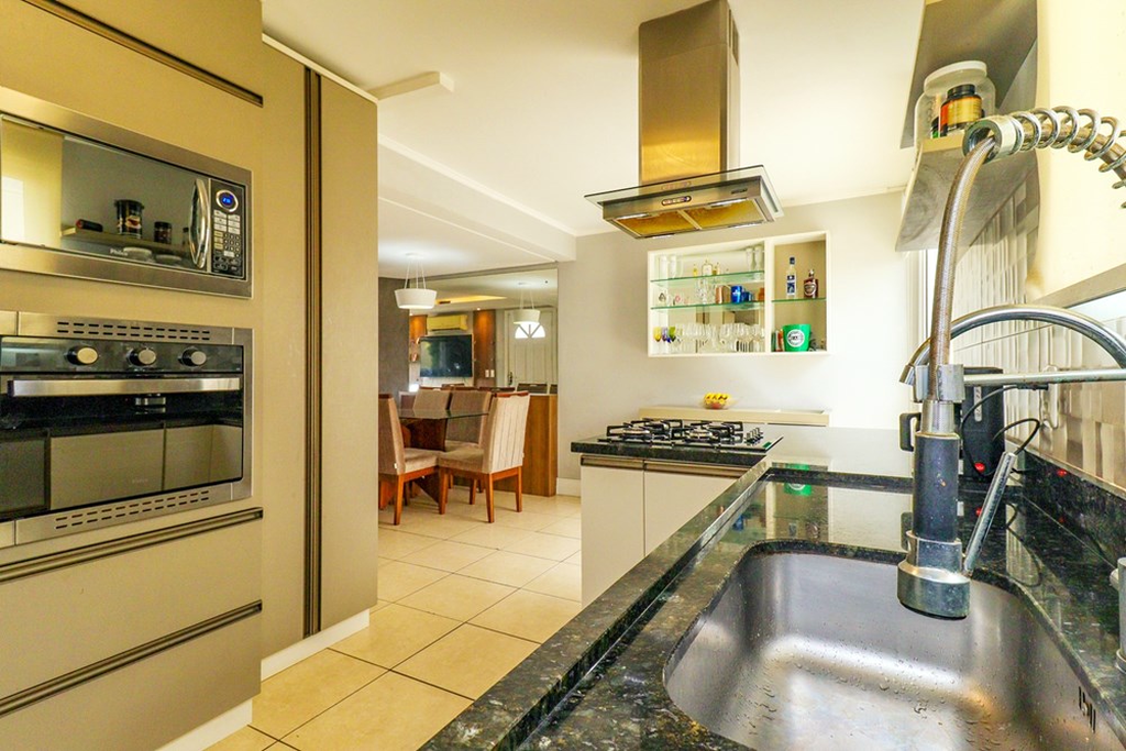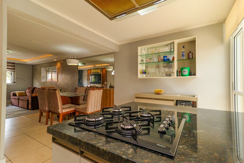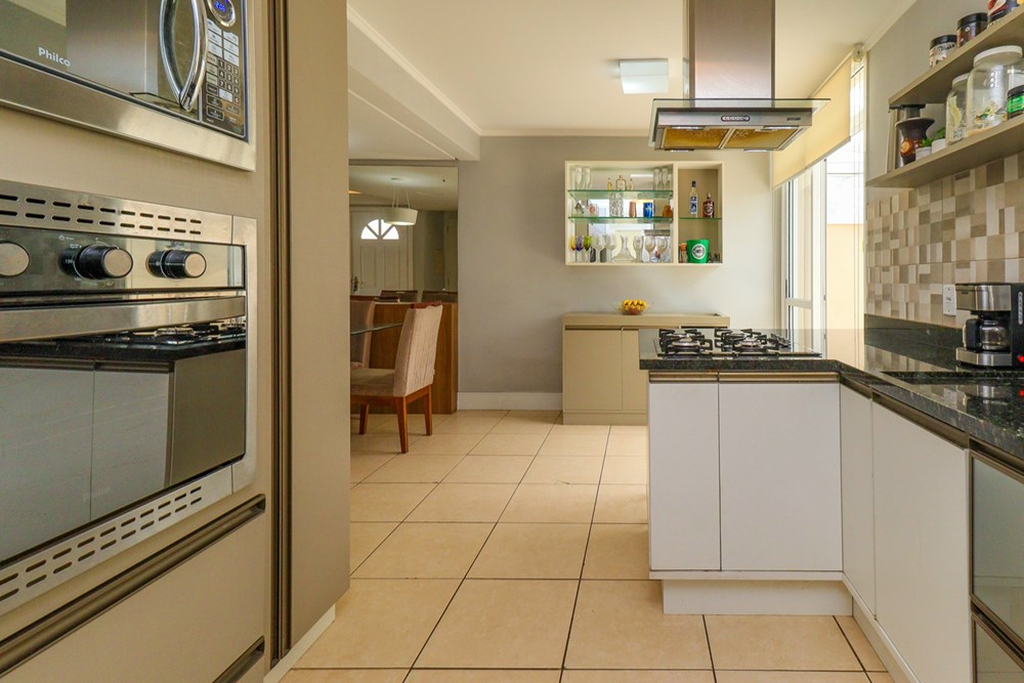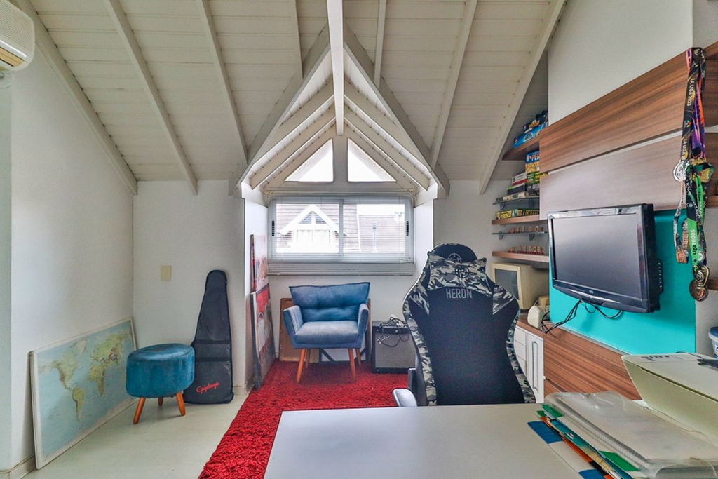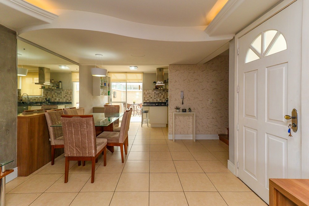 Ampla sala de estar com ar condicionado e uma charmosa lareira, cozinha completa e integrada, uma área fechada interliga com churrasqueira, ainda conta com um lavabo que garante privacidade formando um espaço de convivência perfeito para receber amigos, celebrar e criar memórias em família. A casa ainda conta com 2 vagas de automóvel.