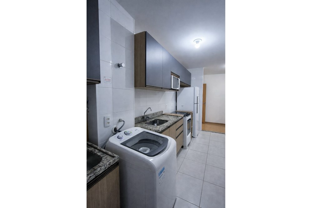 O living se divide em dois ambientes aconchegantes. A cozinha mobiliada e equipada com forno microondas e fogão. Além disso, a área de serviço muito bem planejada com máquina de lavar roupas. O apartamento possui dois dormitórios, banheiro social. Situado no 4º andar, ensolarado com sol poente.
