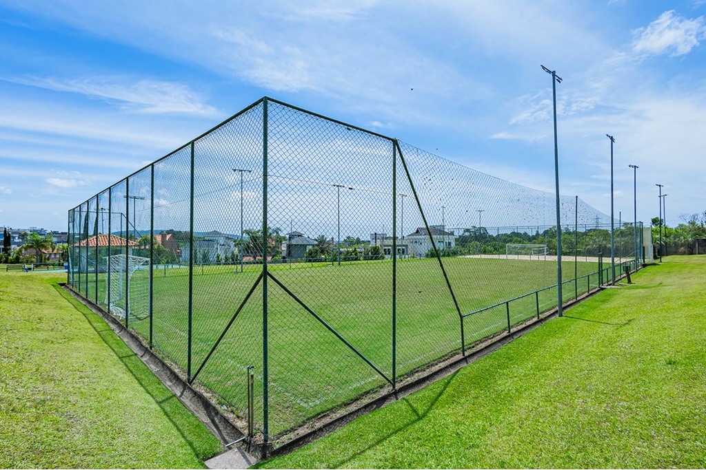A fachada é imponente, com grandes planos de vidro e elementos arquitetônicos que reforçam a integração entre ambientes internos e externos. Tudo isso em uma localização privilegiada dentro de um condomínio fechado de alto padrão.