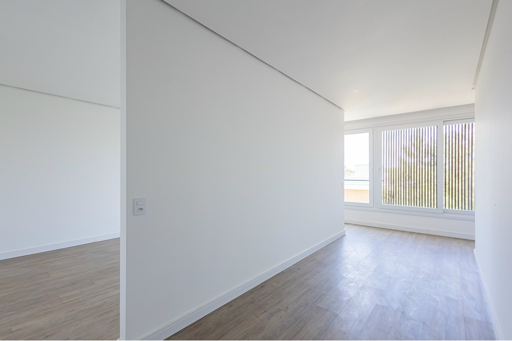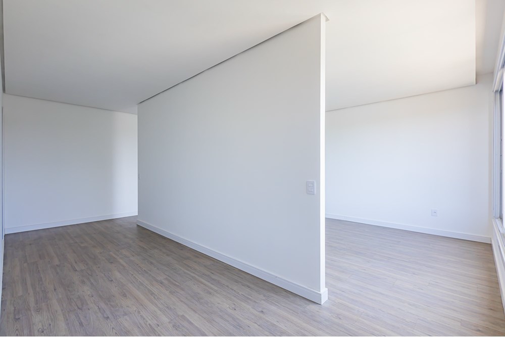 Segundo pavimento: O nível social destaca a cozinha espaçosa com churrasqueira e espaço generoso para instalação de uma ilha. Ela se integra ao living através de um corredor lateral iluminado, que também conecta o ambiente ao lavabo.