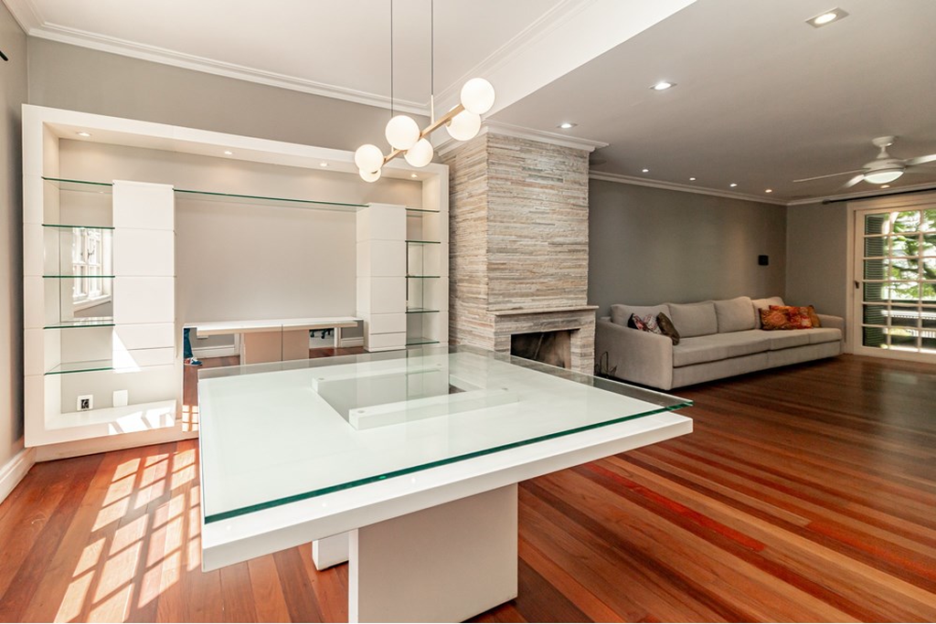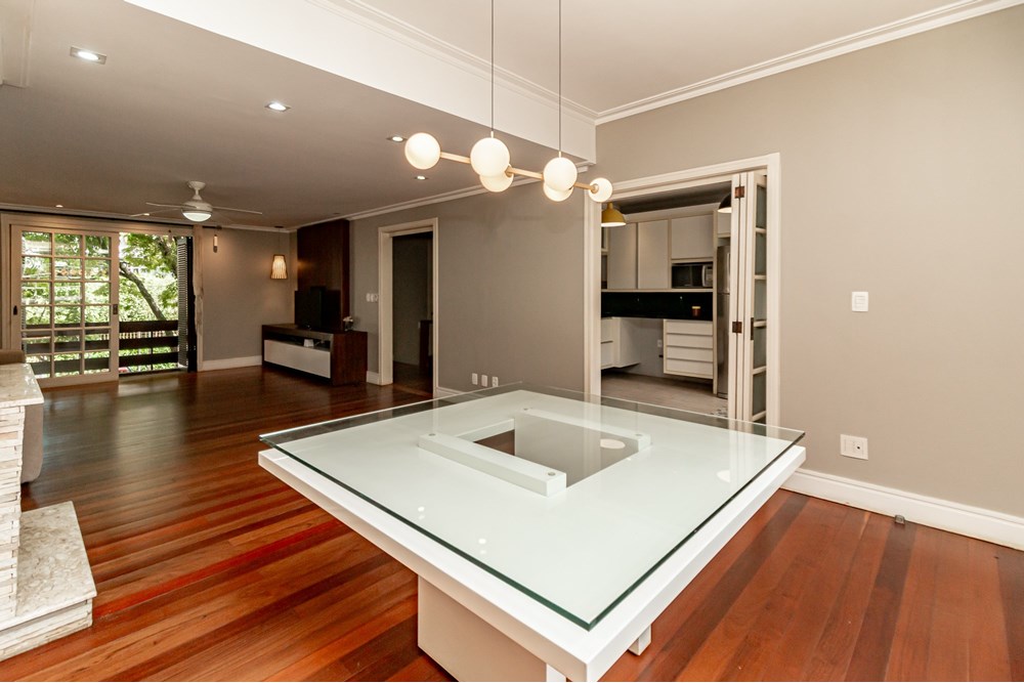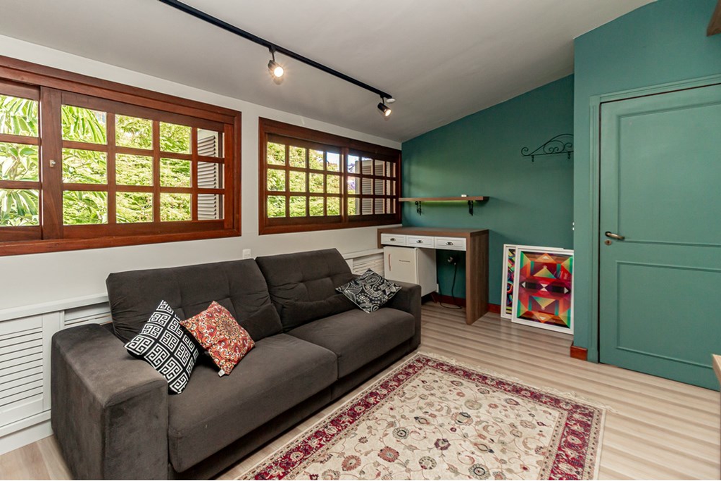O living é amplo, iluminado e integrado, daqueles que convidam a desacelerar e curtir o inverno próximo a lareira.