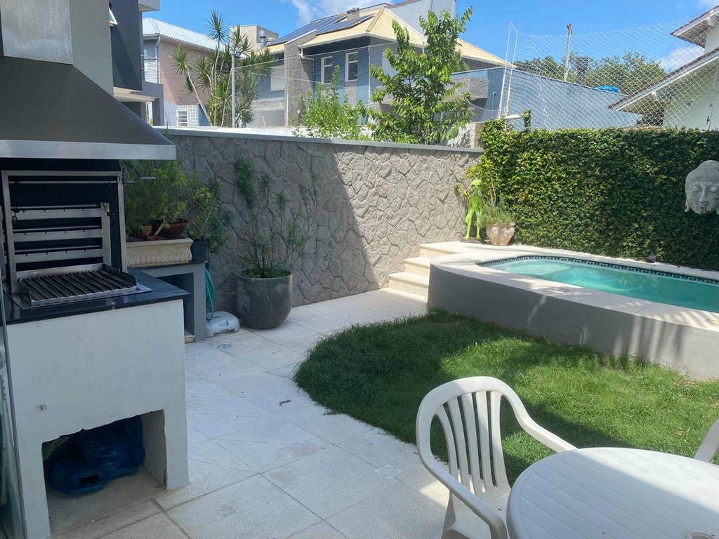 A área de lazer é privativa completa, com piscina, churrasqueira e espaço gramado com coqueiro, proporcionando momentos de convivência e bem-estar.