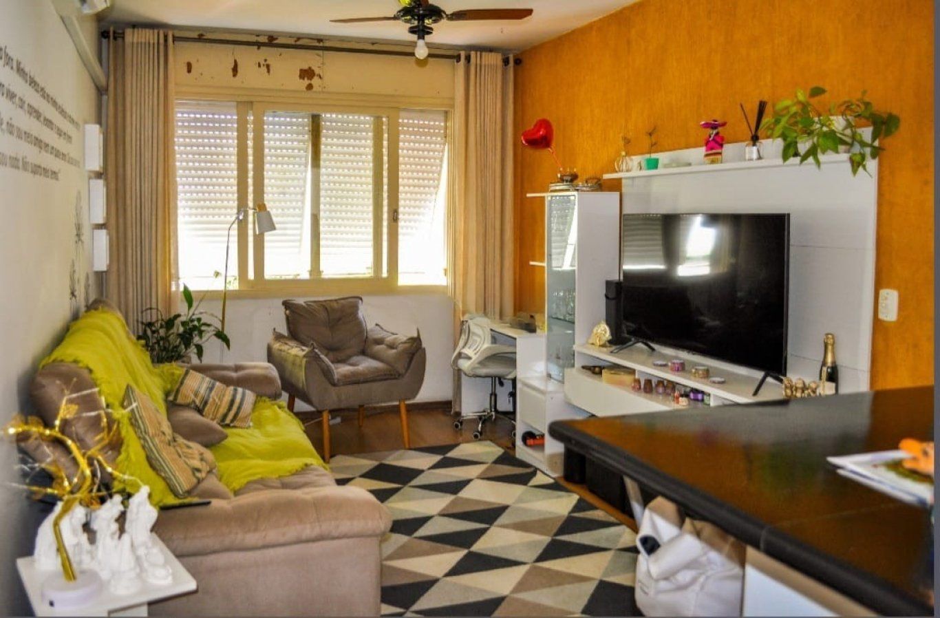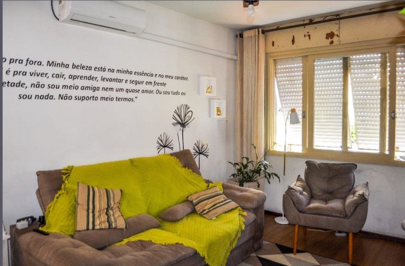 Sala ampla, iluminada e arejada, com móveis planejados, sofá, poltrona, painel para TV, ar-condicionado e janelas amplas com persianas de privacidade.