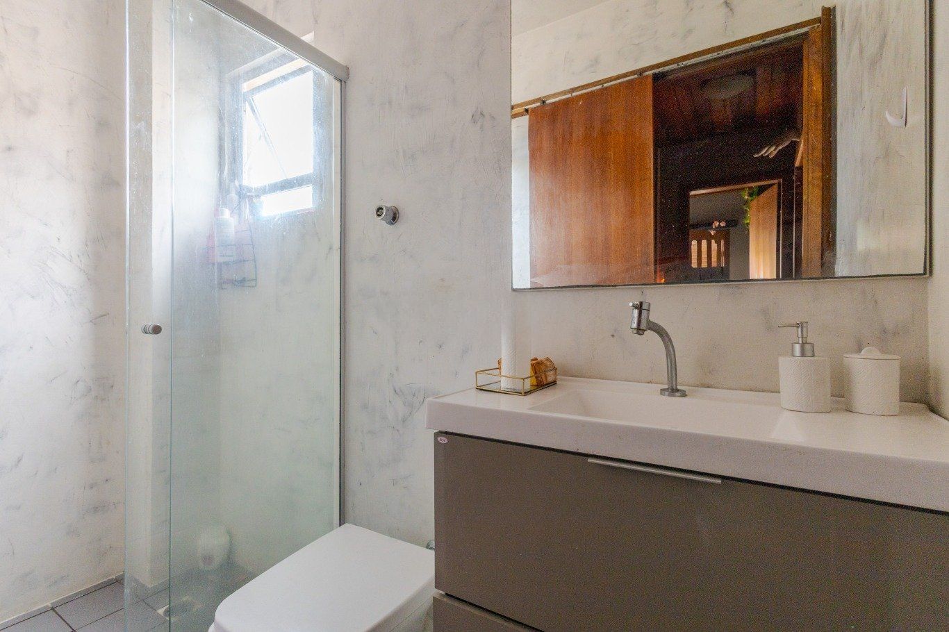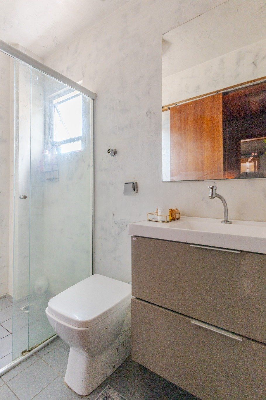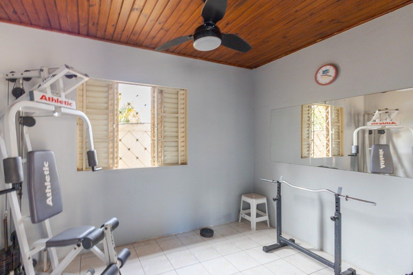 Dois banheiros com ventilação natural e aquecedor de água instalado. Escada em madeira Ipê. Área coberta com vidro e churrasqueira, ideal para momentos de lazer.