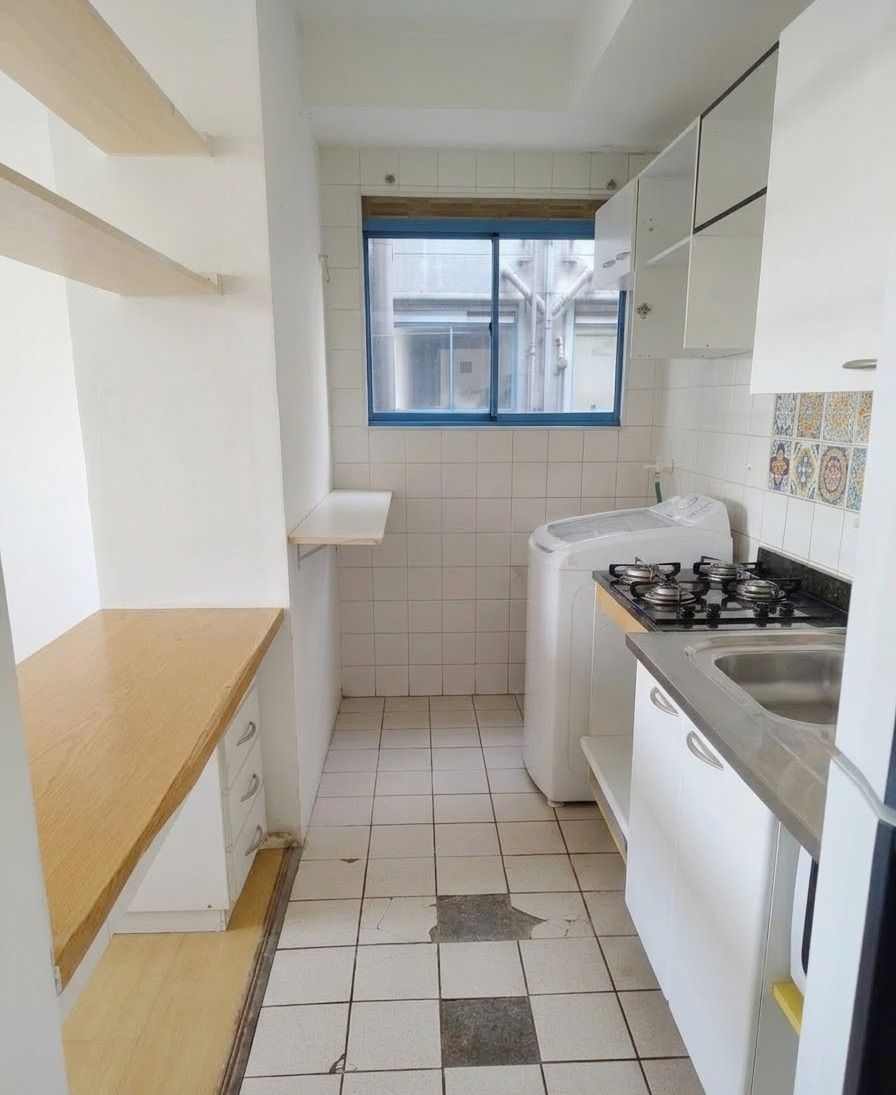Sala, cozinha e banheiro