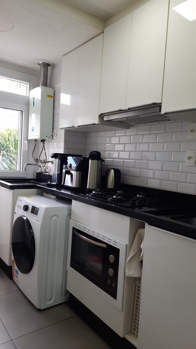 Cozinha com churrasqueira e área de serviço integrada.
