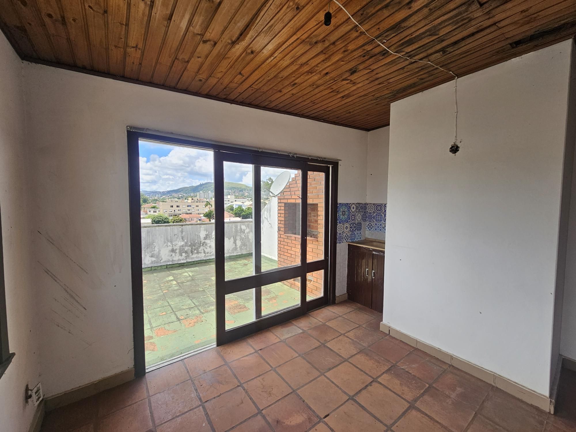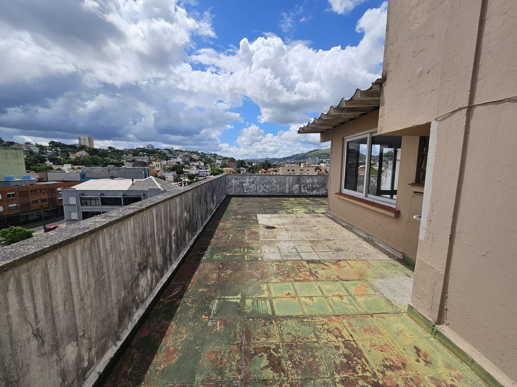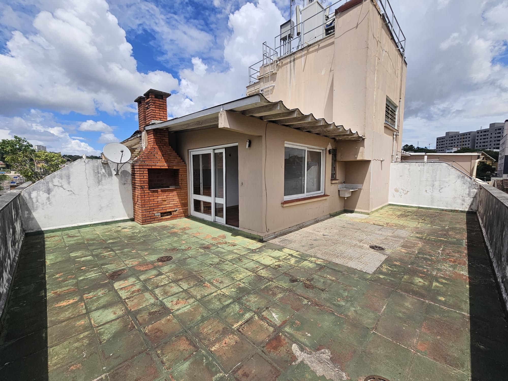 Já na parte superior que o acesso é pelas escadas do prédio, temos uma ampla área coberta, banheiro e uma área externa com churrasqueira e uma vista de quase 360 graus.